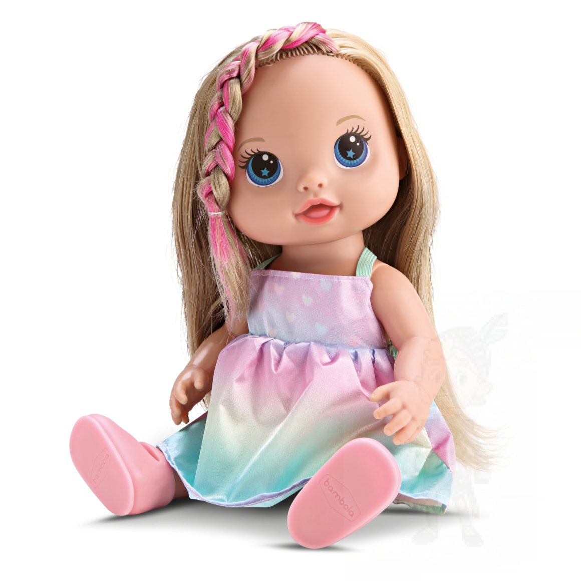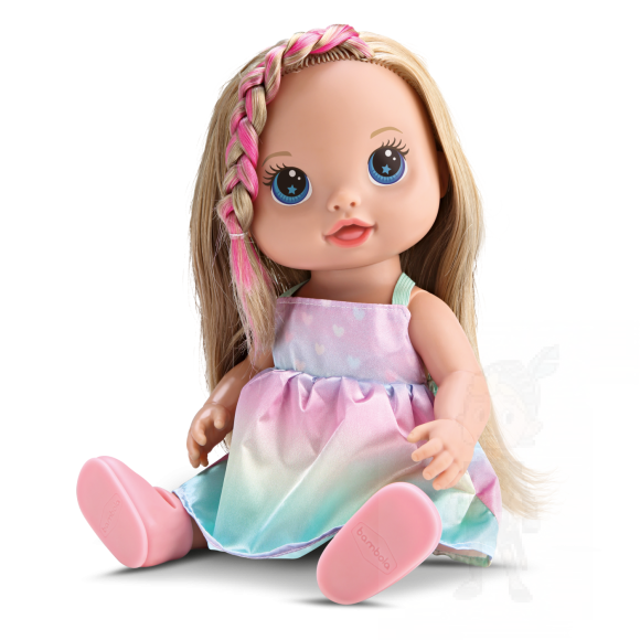 Boneca Loira Cabelo Colorido Buddies Hair Faz Xixi Na/fralda" faz xixi na fralda, isso pode adicionar uma dimensão adicional ao jogo, permitindo que as crianças pratiquem e compreendam habilidades básicas de higiene e cuidado.