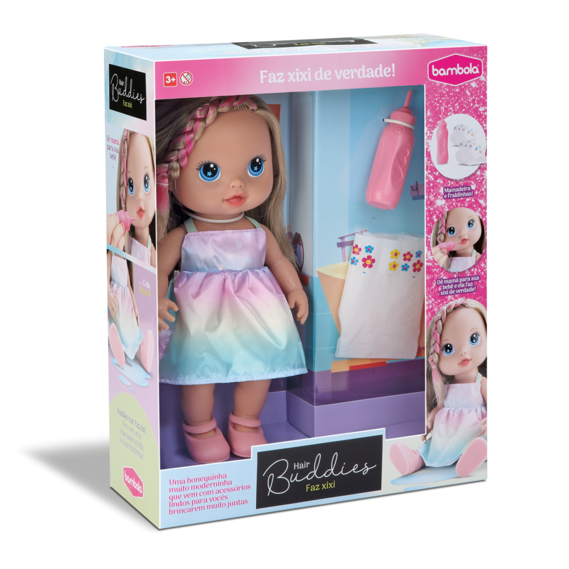 2. BONECA LOIRA CABELO COLORIDO BUDDIES HAIR FAZ XIXI NA/FRALDA
