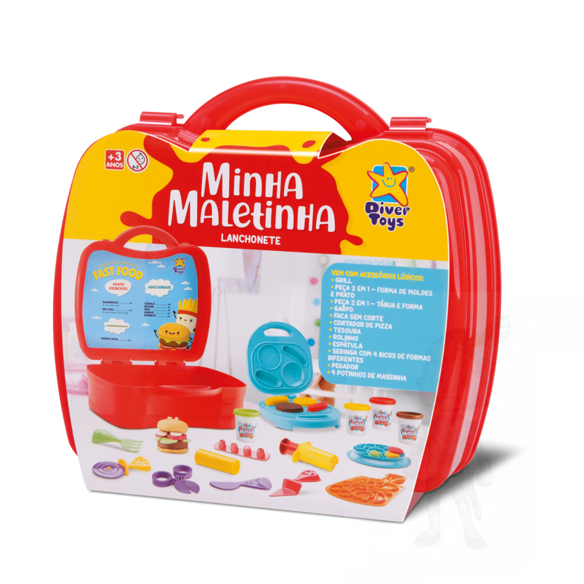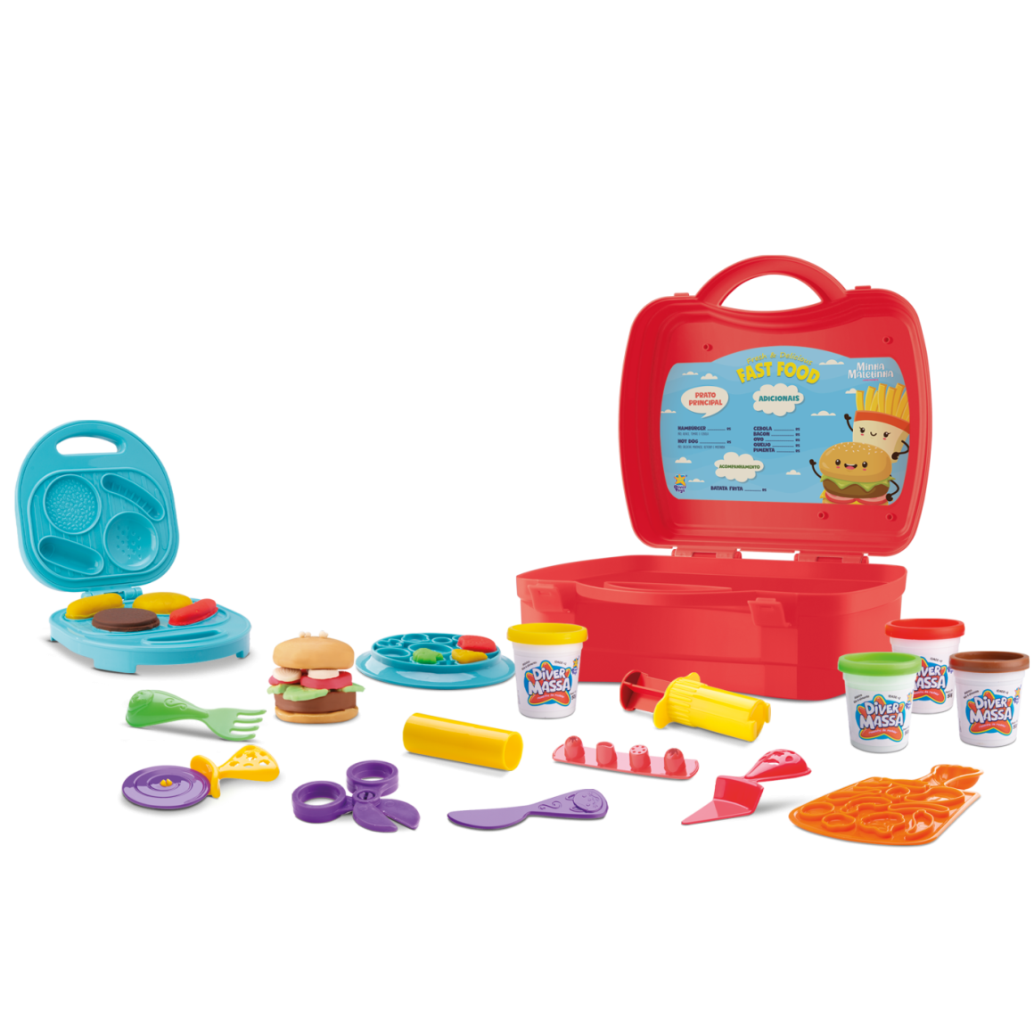 Uma linda maletinha que acompanha 1 Cortador de pizza, 1 Forma de molde, 1 Garfo, 1 Grill, 1 Pegador, 1 Tesoura, 1 espátula, 1 faca, 1 forma, 1 injetor de temperos, 1 maleta, 1 rolinho, 4 Potinhos de massinhas 50gAo abrir a maleta, ela se transforma em uma lanchonete divertida para brincadeiras.